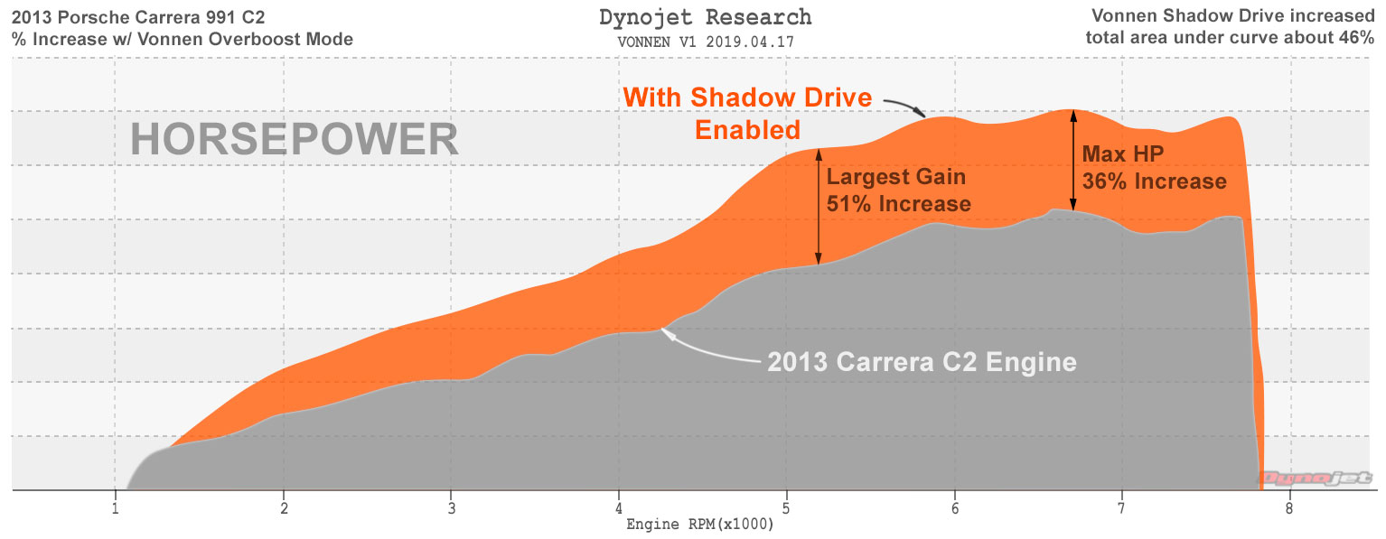 VSD supports a range of Porsche models with varying stock engine power output, in all cases the Vonnen addition is the same. The combined performance potential therefore varies.